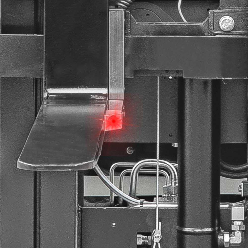Our positioning lasers significantly simplify the stacking and retrieval process and increase the safety for load and rack. The laser sources are integrated into the fork tips, projecting a red line on the area ahead. This allows the operator to adjust the fork more accurately to be able to drive effortlessly into the pallet
