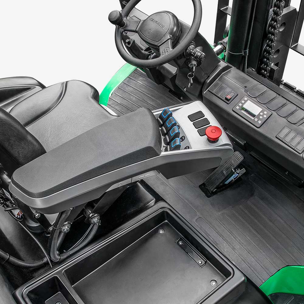 The optimized design of the wide-view mast, wide-view overhead guard and low dashboard enables a broader view of the operator and higher safety.