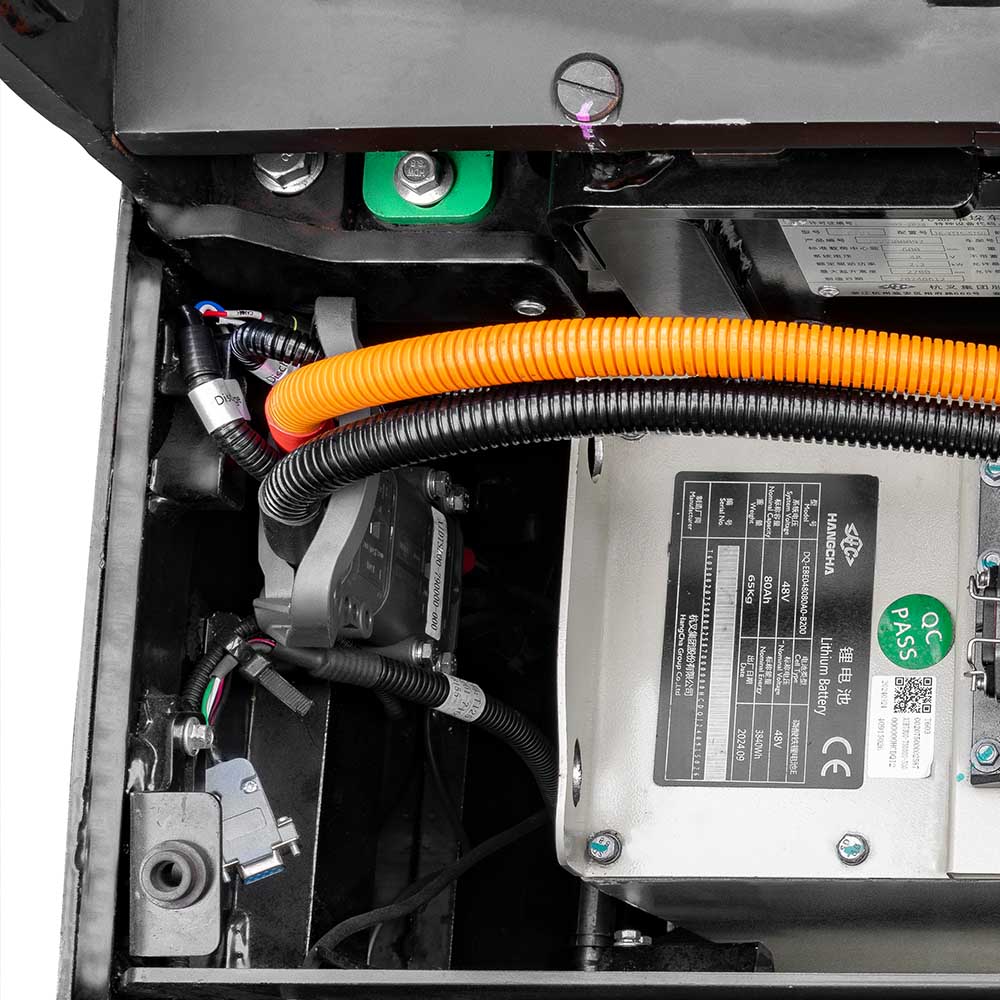 The electric steering feature enables easier and more flexible operation (Stand-on/Rider model). The permanent magnet synchronous drive system has excellent performance and low energy consumption. The 48V power supply system has less heat generated.